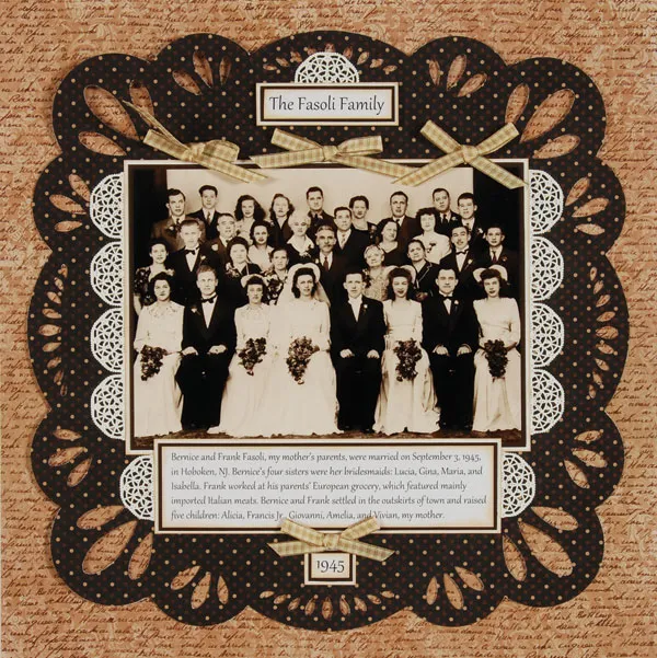 Mat a 7”x5” photo on brown cardstock leaving a 1/8” border. Mat again on white cardstock with a 1/8” border. Ink edges using the Toffee ink pad and a cosmetic sponge. Glue to page centered 3” from the top.