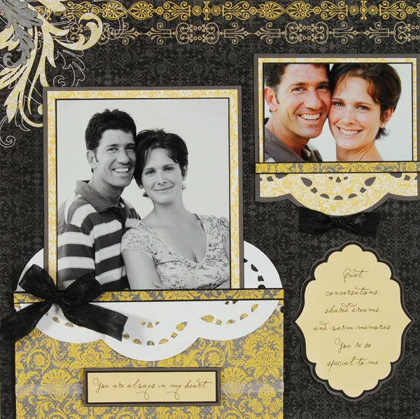 For the punched mat—place a sheet of yellow/white flourishes paper flush with the corner guide and punch. Now flip the paper and place the adjacent side of the paper flush with the corner guide and punch. Remove the paper. Place the punched piece beneath the small matted photo with a scallop centered below the bottom edge. Glue the matted photo in place and trim sides evenly with the yellow/white mat. Mat the photo plus scalloped edge on gray with 1/8” borders. Cut a 4 3/4"X1/4” yellow/gray vines paper and mat on black with 1/16” borders. Glue across the bottom of the photo as shown. Glue to the page, even with the right side and 1 1/2” from the top.