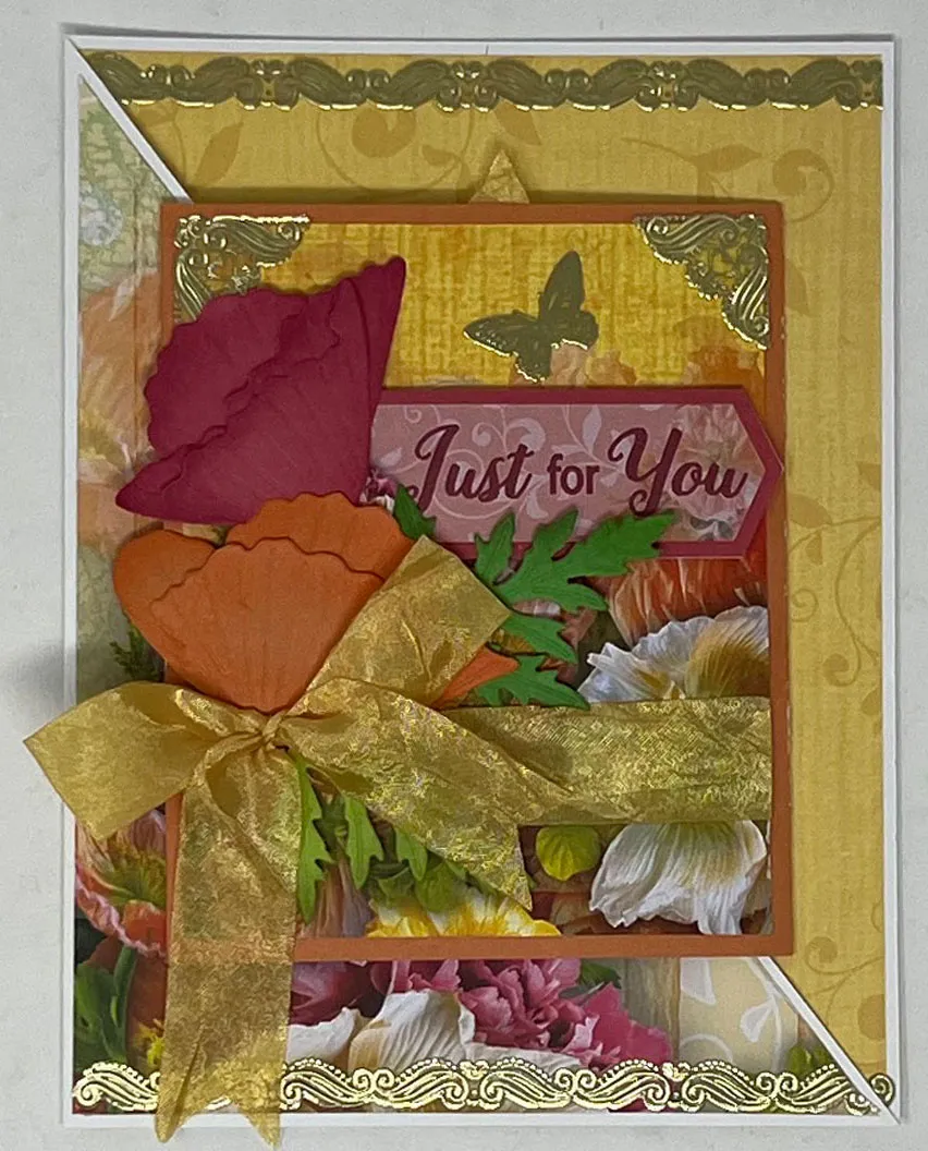 5. Foam tape the “just for you” label to the upper front and place a gold butterfly Dazzles™ above it. Place gold corner Dazzles™ on the upper two corners of the floral cardstock.