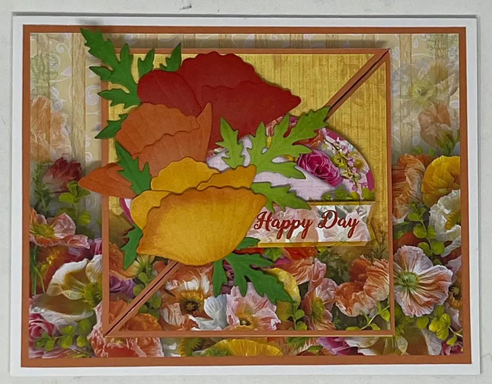 5. Die cut petals for a red, an orange, and a yellow cardstock poppy blossom. Ink the petal edges with matching color inks, then layer and glue them into blossoms. Die cut three leaves from green cardstock and ink the edges. Glue the blossoms and leaves to the label and left front pop-up panel as shown.