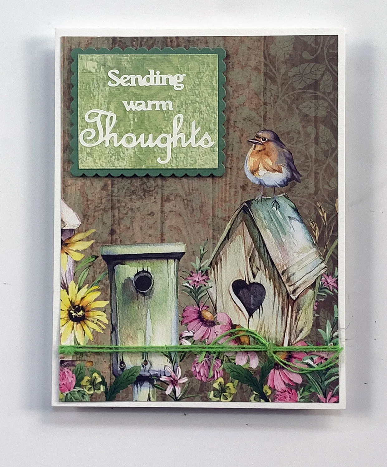 For the card front: Cut 4¾"x6¼" A Nesting Place brown birdhouse cardstock with the bird at the right. Wrap two lengths of lime green jute across the cardstock, 7/8" from the bottom, and secure the ends on the back. Glue the cardstock centered on the front. Cut two 4" lengths of lime jute, hold together, and tie them onto the first jute, 1 3/8" from the right card edge.