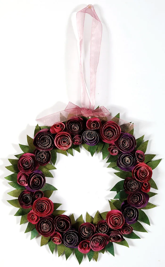Finish assembling the roses by following the instructions on the template; Zots™ are great for attaching the rose to its base. Arrange the roses in a row, ordering them how you want to see them on your wreath. Place a Zot™ onto the base and attach a large rose. Attach all roses this way, until you’ve covered the whole base.
