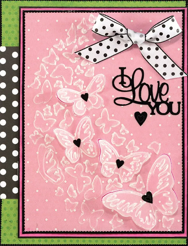 Place Inside/Outside Dazzles™ “I Love YOU” on the vellum to the right of the butterflies. Add a heart near the words, and a smaller heart on the center of each butterfly as shown. Add Black Thin Lines Dazzles™ on the edges of the vellum and the green dots paper. Use 1/2" wide white/black dotted ribbon to tie a bow. Zot™ the bow above the words as shown.
