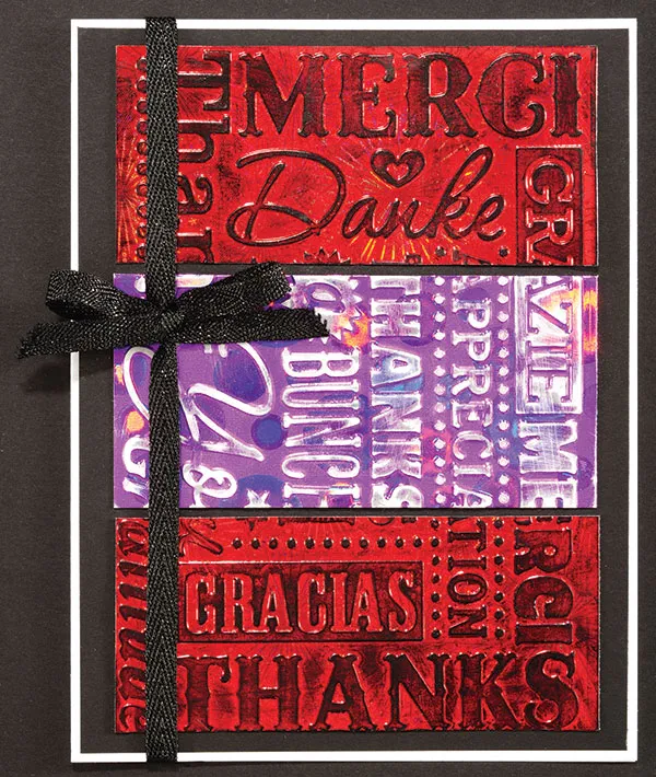 Front: Place the card fold on the side and glue 4 ¾”x6 ¼” black cardstock to the card center. Cut one 4 ½”x2” rectangle of Purple Circle Holographic paper and two 4 ½”x1 7/8” red holographic paper. Place the purple sandwiched between the red inside the Thank You embossing folder and emboss. Use the StazOn® ink pad surface to color the embossed areas of the red holographic strips and sand the purple circle. Glue them, as shown, to the card center. Wrap black glitter ribbon around the card, ¾” from the fold and tie a bow. Place a Zot™ under the bow to keep it in place.