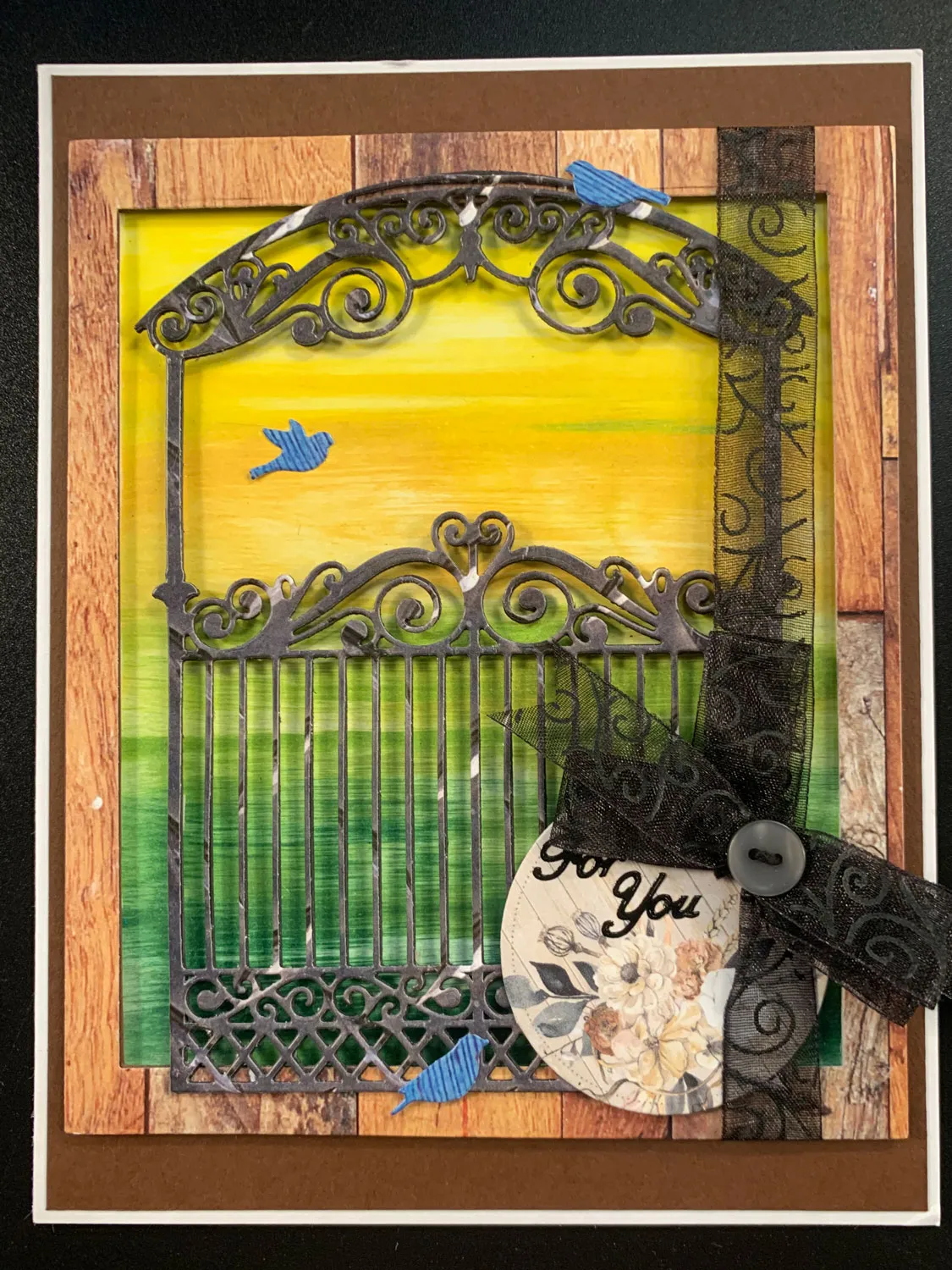 Wrap a 7" black swirl sheer ribbon vertically over the panel, ½" from the right edge, and glue the ends to the back. Glue the panel to the center front. Die cut the gate from Wood & Texture diamond plate steel paper and twice from dark brown cardstock. Stack and glue the gates together with the diamond plate gate on top. Center the gate over the frame, tucking the right edge under the ribbon, and glue the top and bottom edges in place.