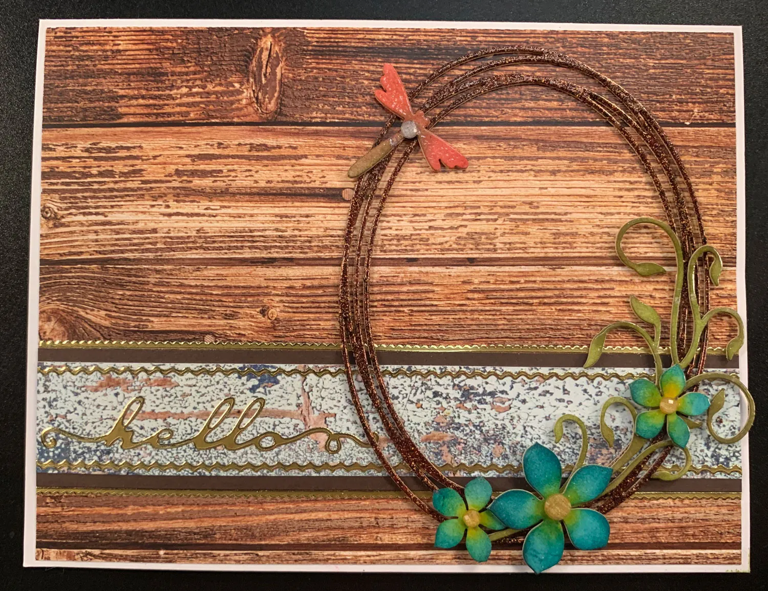 Press the chipboard pieces onto the watermark ink pad, then emboss them with Clear embossing powder. Set aside the flourish, butterfly, two small flowers, and one large flower. Glue the branch extending from the wreath bottom up the right side. Glue the three flowers and dragonfly as shown. Place sparkles in the flower centers and on the dragonfly’s body.
