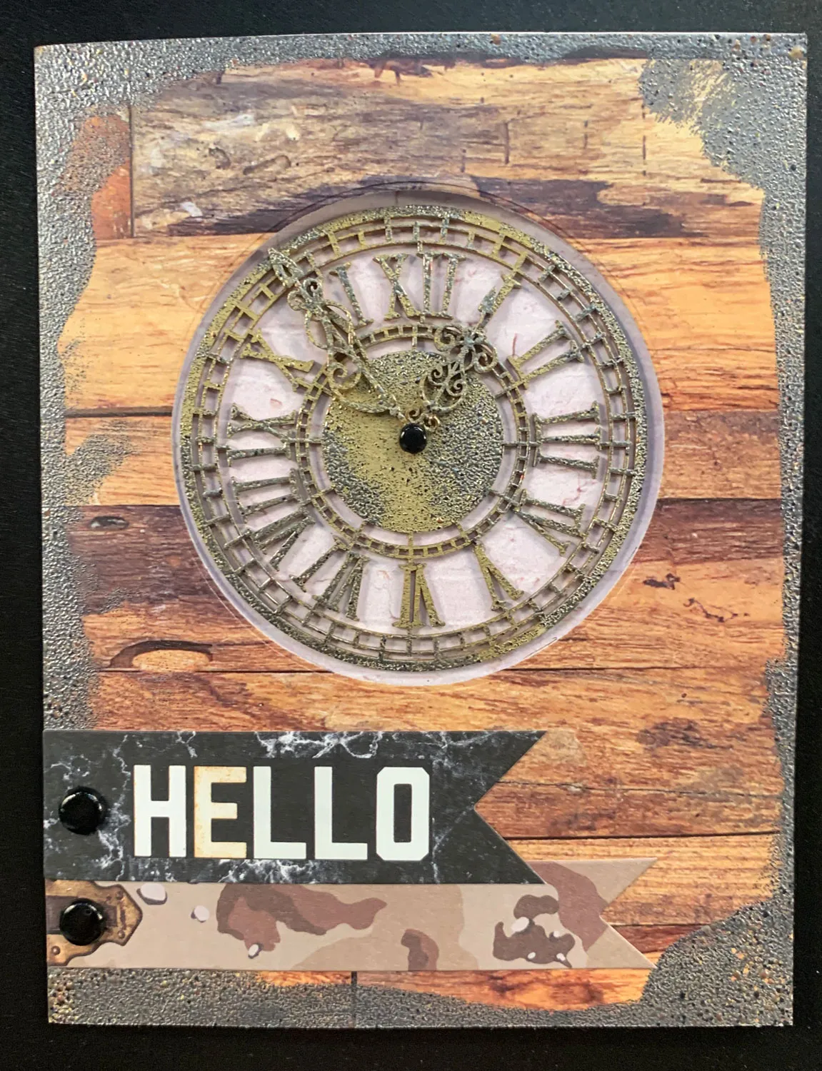 Ink the clock and hands, then lightly emboss them with the powder, allowing gold ink to show in places. Attach the hands to the clock with a mini brad. Close the card and glue the clock to the pop-up mechanism through the window. Open the card.