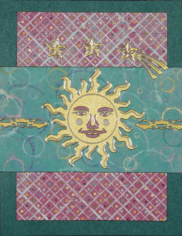 Line the sun face only, with purple paper and adhere to the center of the teal circle strip. Place lengths of border extending in from the right and left sides toward the sun. Place 2 stars and 1 shooting star centered over the sun on the purple dot paper. Adhere “Celebrate” at the bottom of the card.