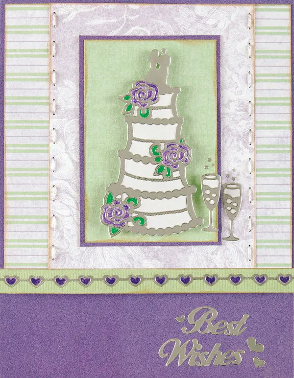 Ink the edges of the paper ribbon and a add heart border sticker. Color in the hearts. Cut a mat of green paper and mat with purple paper. Back the Cake with glimmer paper and add color to the roses, as shown. Foam tape the cake to the mat and add the glasses Dazzles™ to the side.