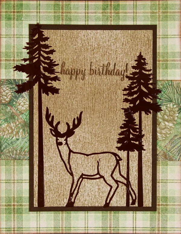 Adhere a tall tree on the left side of the card and 2 shorter trees on the right side. Adhere a large deer between the trees. Stamp “Happy Birthday” in the area above the deer. Stamp "Happy Birthday" above the deer.