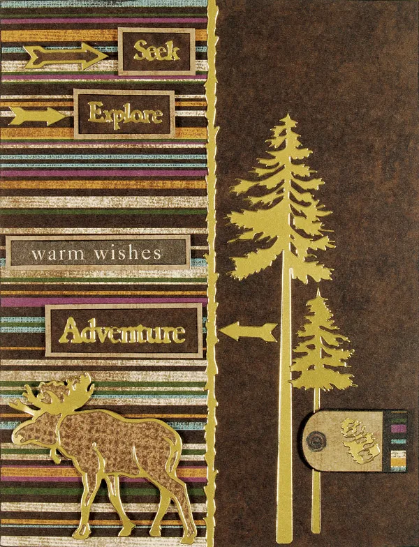 Back the moose with texture paper and foam tape to the striped paper. Add large tree stickers to the dark paper. Foam tape a small tag with a pine cone overlapping the trees.