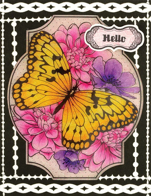 Take a sheet of acetate and spread a thin layer of translucent embossing paste onto it (use the mini squeegee), covering about a 5 1/2"x6" area. Spread the embossing paste as smoothly as possible in a thin, even layer. Carefully place the butterfly image face down onto the embossing paste and gently rub over it to adhere the entire surface. Let dry overnight. Once dry, run the piece under water to saturate the paper with water. Start peeling off the paper in large pieces as much as you can, then start rubbing the surface with your fingers to rub off the paper fibers. Add more water if necessary. Once the paper is all rubbed off, let dry. The surface will be matte, not shiny. Color this surface with Spectrum Noir™ pens (BP6, BP2, PL1, GB5, CT4, CT2, LV3 & LV2). Cut a piece of clear glitter adhesive sheet to fit over the image. Peel off the backing and apply to the image on the surface you just colored. Rub down to adhere evenly. Position the piece in the center of the window on the front of your card, with the acetate on the front and the glitter sheet on the back. Trim off any excess going past the card edges. Use Zips™ to Glue down to the card surface. Take the black cardstock window piece and glue over the image. Decorate the black cardstock with White Jewel Border Dazzles™ as shown, trimming to fit. Stamp a small label and "Hello" on pink lace paper. Mat on white cardstock with a 1/16" border. Foam tape to the card 1/4" from the right and 1" from the top.