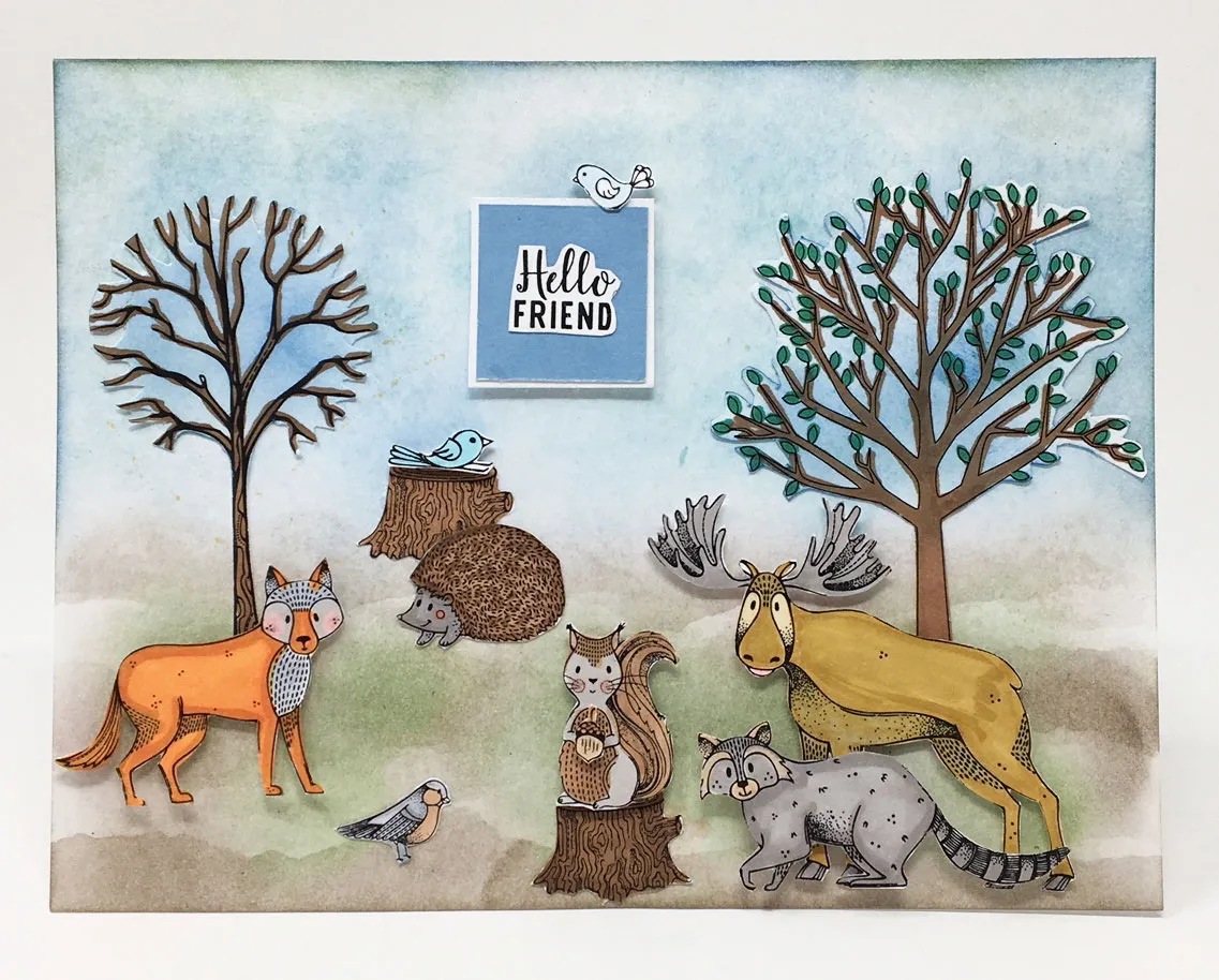 Debbie colored her blank card using the Blender Brushes with blue, green and brown ink pads. She stamped the trees, stumps and one bird using Finesse Noir Black Alcohol-Proof Dye Ink Pad as shown. She colored using Tri Blend Markers. She stamped the animals, acorn, greeting and two birds on white cardstock then colored in with the Tri Blends and cut out. She foam taped them to the card as shown.