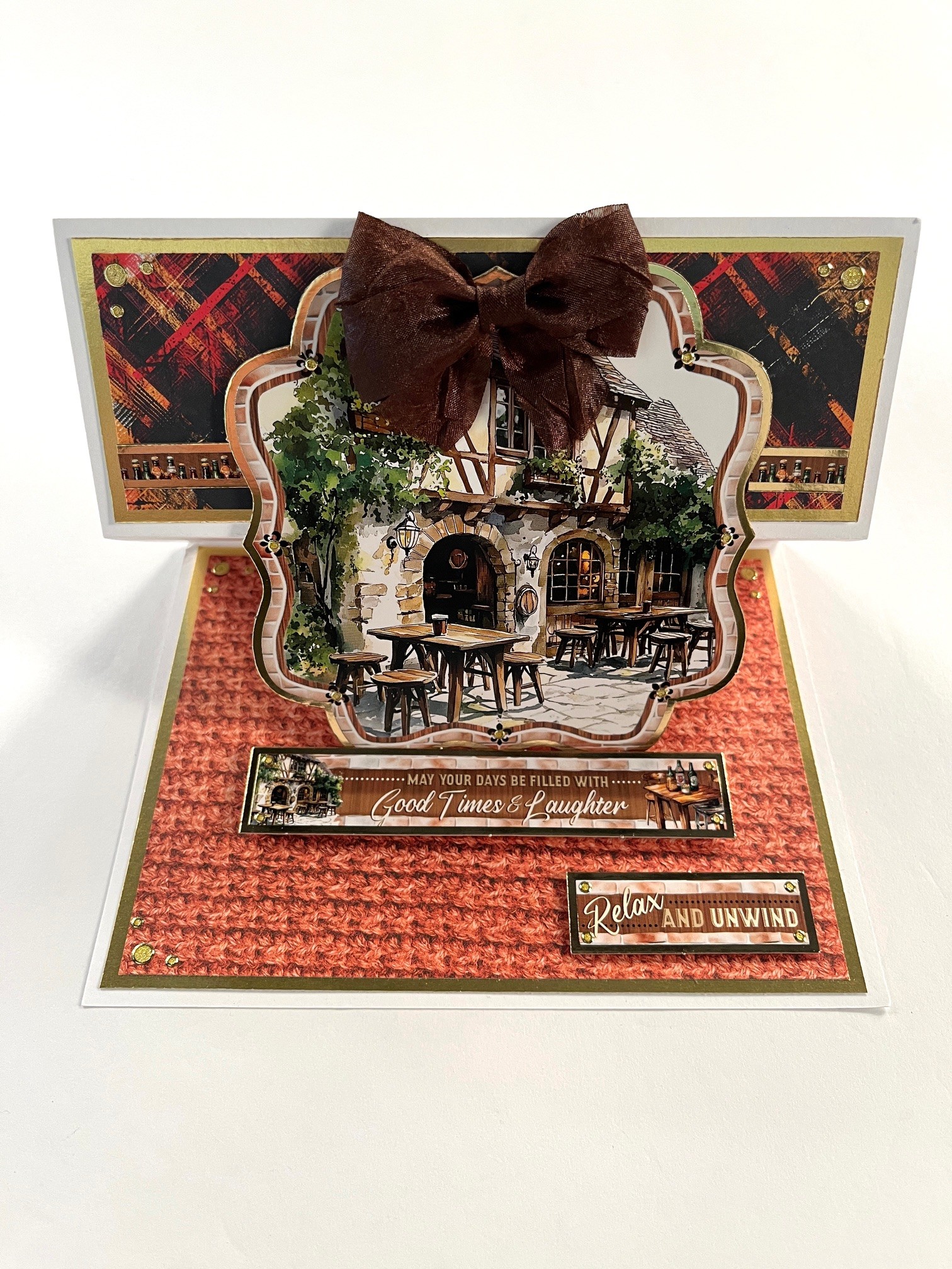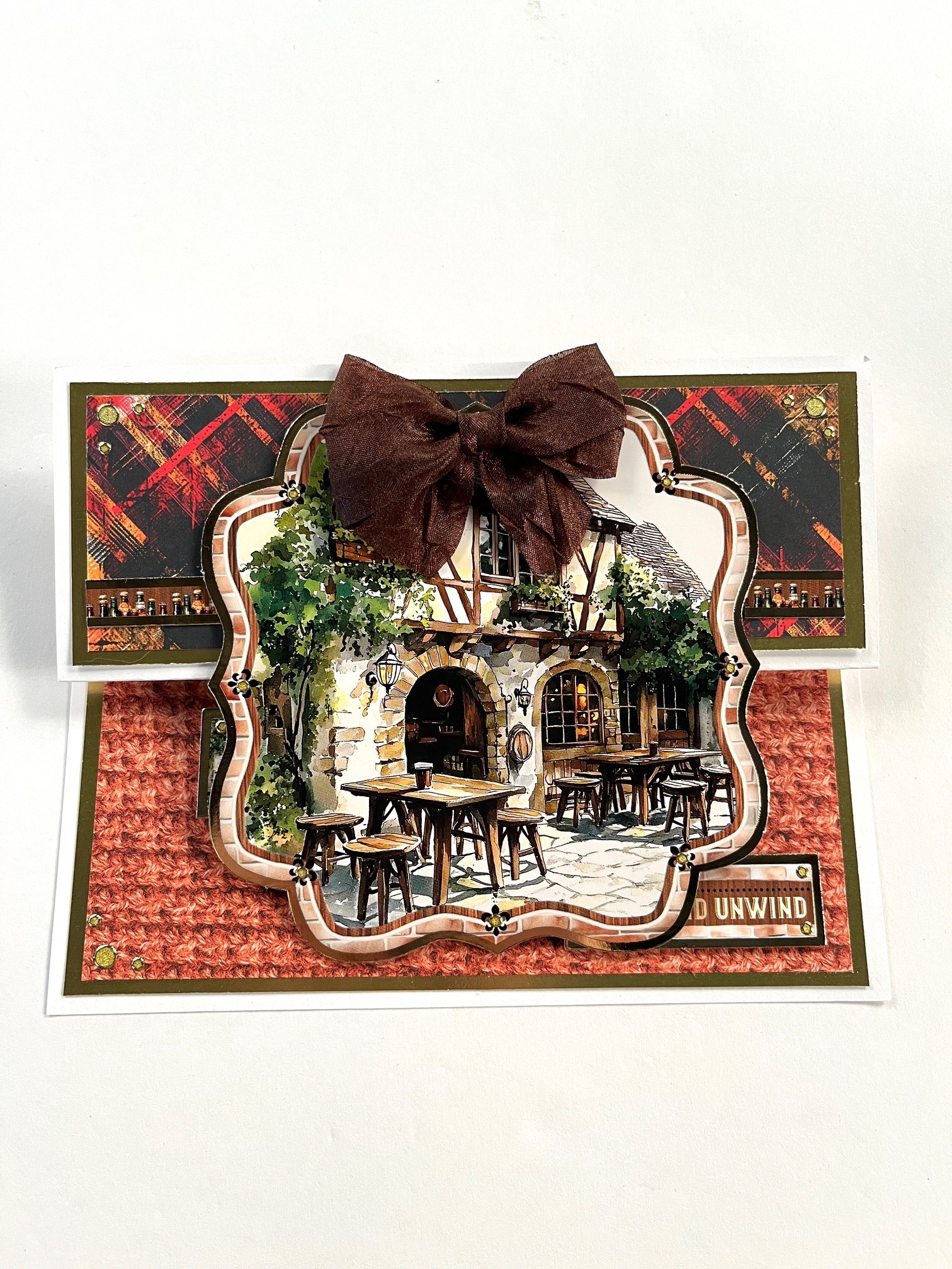 Add gold pearl Dazzles™️ in the corners of the front facing plaid paper. Cut the bottle border in half and tape to the plaid paper to go behind the Topper. Foam tape Topper centered at the top so when flat the Topper lies 1/4” from top and bottom. Add Dazzles™️ around the Topper. Make and Zot™️ a 2 1/4” wide crepe bow from the Brown Ribbon Set at the top of the Topper.