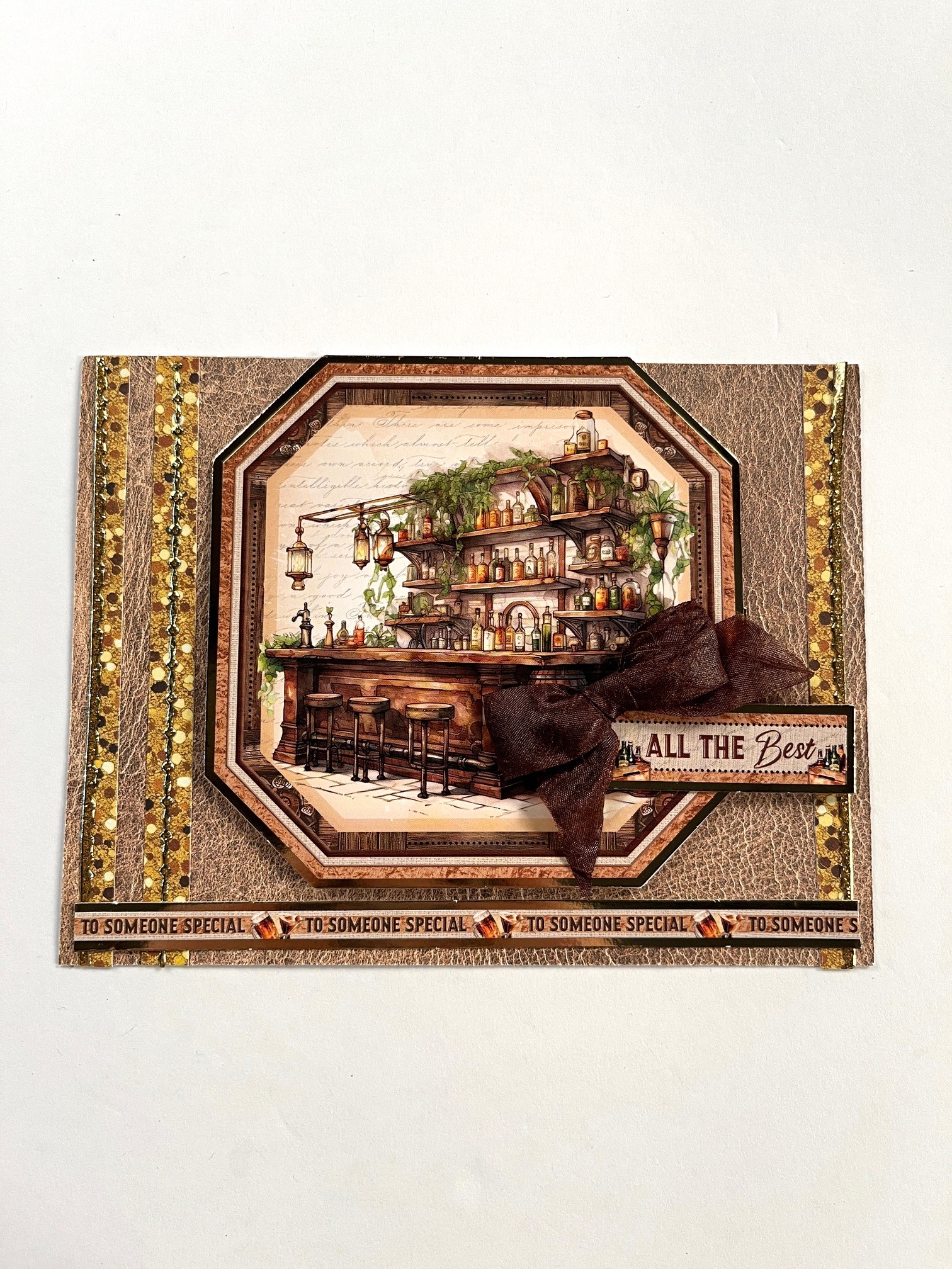 Glue “All The Best” Topper sentiment onto the bottom right Topper leaving the right end clear of adhesive. Make and Zot™️ a 2” wide crepe bow from the Brown Ribbon set and place at the top left corner of the sentiment.