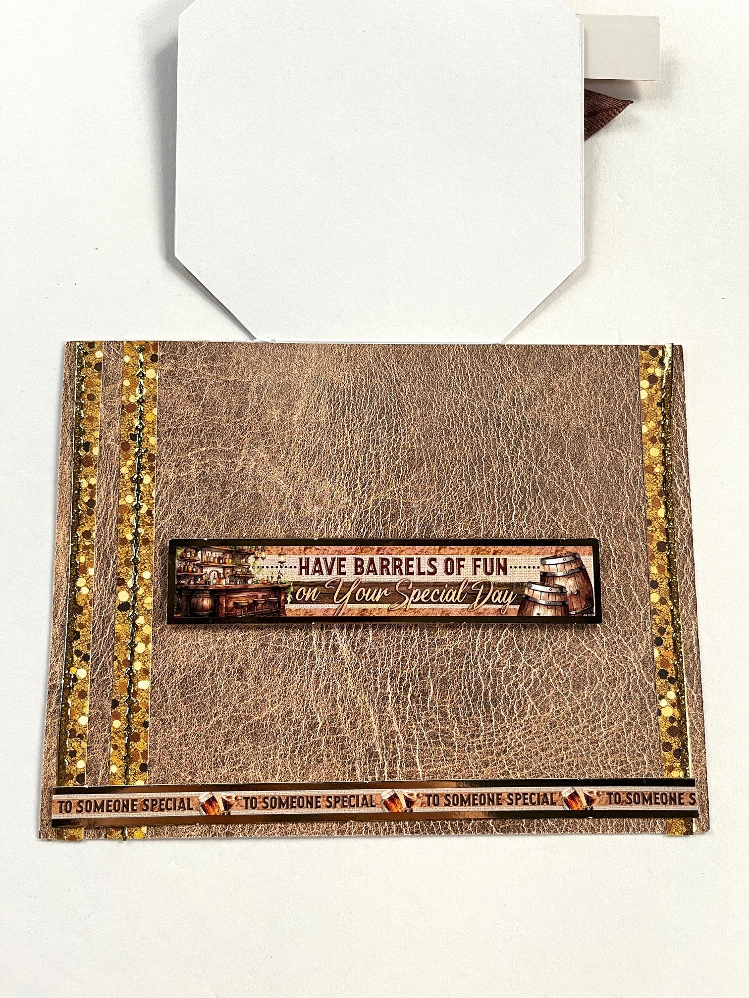Card inside: Place glue along all sides of the card, lay the leather effect paper from the Textile Fabrics & Fibers 8x8 paper pad on top, and trim off excess. Cut three ¼”x5” strips of the dotted paper from the paper pad. Glue one ¼” from the left side and then another 1/4” from the first. Glue the last 1/4” in from the right side. Place gold Jewel border Dazzles™ as shown. Glue the Topper border strip 1/4” from the bottom. Foam tape “Have Barrels of fun Your Special Day” 2” from the fold so it lies in the center of the main Topper when the card is closed.