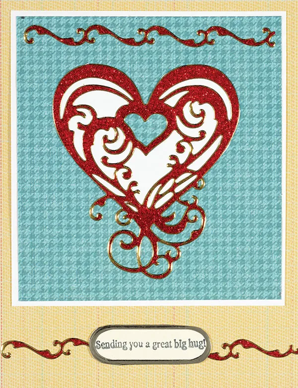 Back the small heart inside the largest red heart Dazzles™ with aqua houndstooth paper and then back the entire heart with white cardstock. Glue to the houndstooth rectangle as shown. Place a 4 1/4” length of red border Dazzles™ across the top of the rectangle.