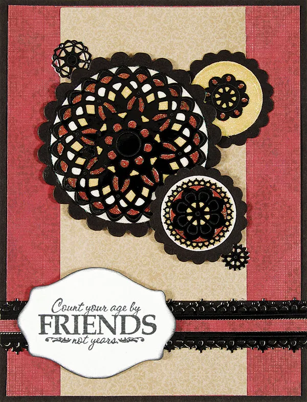 Cut 5”x1/2” strip black cardstock. Glue 5”x1/4” burgundy to center of strip and place border Dazzles™ on either side of burgundy strip. Glue to bottom of card 1 1/2” from bottom. Trace Design Tool Kit #2 Tiny Label on white cardstock, cut out and stamp “Count your age by friends…” sentiment. Use the cosmetic wedge to add black ink to edges of tag. Foam tape to bottom left of card 1” from bottom.