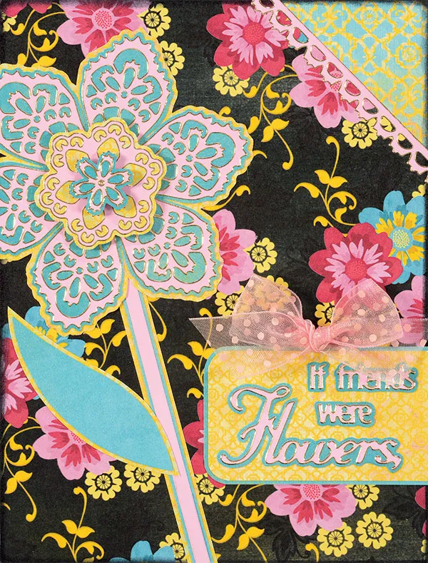 For the Front: Place the card with the fold on the left. Cover with black floral pattern. Cut a 2" square of teal/yellow pattern and cut in half diagonally. Glue one of the resulting triangles to the top right corner. Use black StazOn® and a cosmetic sponge to ink all the edges. Place the largest lacy flower on teal paper and cut out, leaving a 1/16" border. Mat on yellow paper with a 1/16" border. Glue to card 2" from the right and 1/4" from the top. Trim any excess. Mat the medium lacy flower on yellow paper and foam tape it to the center of the large flower. Mat the small lacy flower on teal paper and foam tape it to the center of the flower, as shown. Cut a strip of the pink Dazzles™ material 4" long and about 1/4" wide. Place it on teal paper and cut out, leaving a 1/16" border. Mat on yellow paper with a 1/16 border. Glue this "stem" to the card, at an angle as shown. Cut a simple leaf shape about 2 1/2" long and 3/4" wide from teal paper and mat on yellow with a 1/16" border. Glue to the stem on the left side as shown.