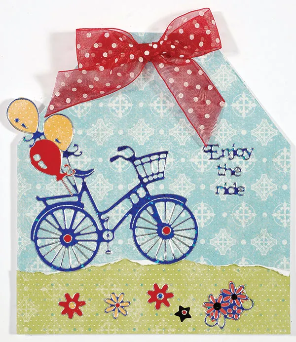Back Bike & Baskets balloons with yellow paper and glue to the back of the bike and extending off the edge of the card as shown. Place a single balloon from Red Happy Birthday Dazzles™ among the yellow balloons. Place “Enjoy the ride” Bikes & Baskets Dazzles™ to the right as shown. Place flowers from Bikes & Baskets, Red Happy Birthday Dazzles™ and a star from Party Animal Dazzles™ at the card bottom as shown. Use 3/4” wide red dot sheer Happy Days Ribbon to make a bow and Zot™ to the top of the card as shown.