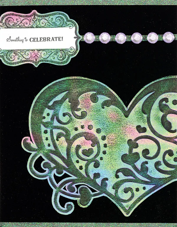 For the front: Place your card with the fold on the left. Cover the card with black suede paper. Place 5"x1/8" strips of clear glitter sheet across the top and bottom, and a third one 1" from the top. Emboss the swirly heart on purple textured iridescent paper. Rub over the image with a black StazOn® ink pad and let dry. Cut out the heart and glue to card 3/4" from the left and 1/2" from the bottom. Trim excess. Stamp a curvy label on purple iridescent paper and cut around leaving a 1/16" border. Stamp again on white cardstock. Stamp a greeting in the center on the cardstock and cut around the greeting on the straight lines. Glue this centered on the label. Glue the label to the card 1/4" from the top and 2 3/4" from the right. Trim excess. Place 6 large lavender bling in a row along the glitter strip as shown.