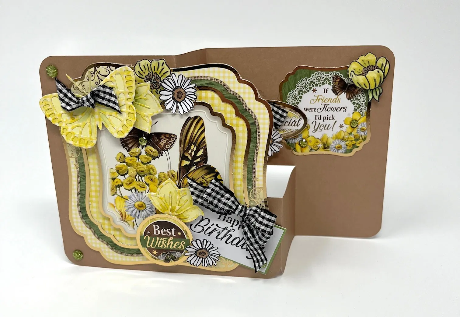 Use the Tri-Fold Surprise Card cutting die with tan Pastel cardstock to make the card. Use the corner rounder on all outside corners. From the "Someone Special" Topper sheet attach the large square Topper frame onto the yellow gingham double-sided paper and trim around it. To create a smooth appearance, attach the backed Topper onto another piece of the tan pastel cardstock and trim out again. Glue to the card. Foam tape the center Topper in the middle of the yellow gingham paper. Foam tape "Best Wishes" on the bottom.