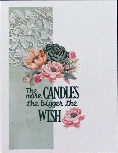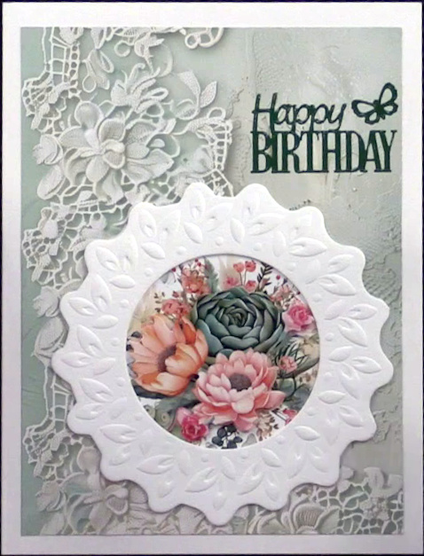 1. Cut 4 ½”x6” lace border Plant Paradise paper and glue to the card front. Select the round embossed frame and glue the #1 piece behind it. Then glue to the card placing it toward the bottom.
