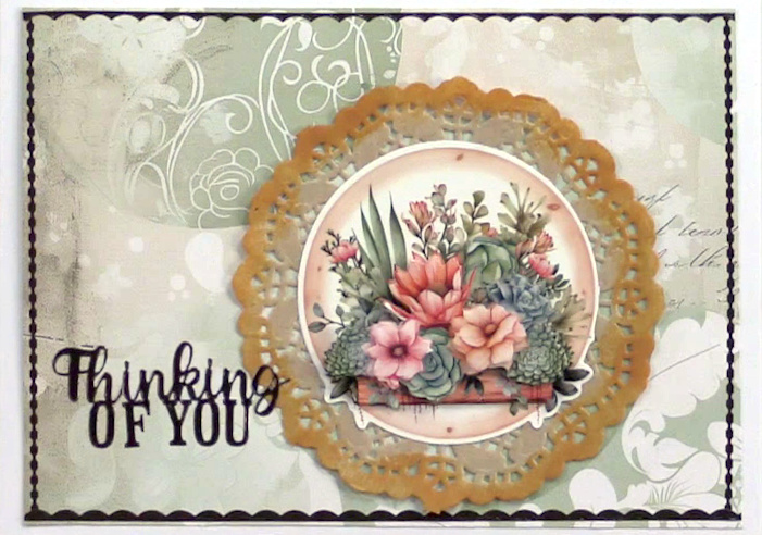 3. Remove #1 pushout and glue on the doily. Foam tape #2, #3 and #4 over the matching art. Place brown “Thinking of you” from We’re Together Dazzles™ as shown.