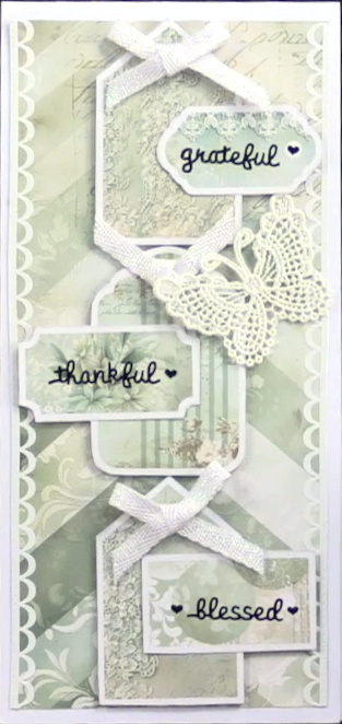 2. Cut out three tags and three small labels. Foam tape the tags along the center of the arrows. Glue and foam tape each tag alternating the sides that hang out. Place grateful, thankful and blessed Dazzles™ on each label with a little heart.