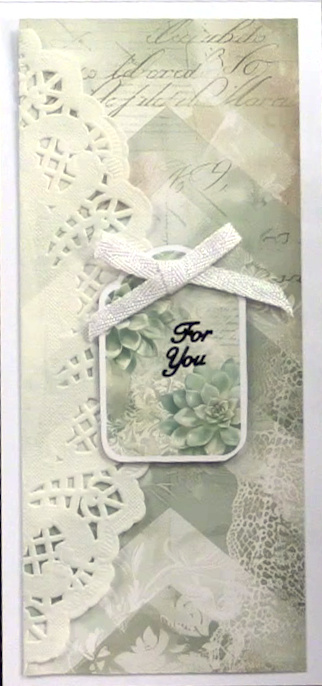 4. Inside: Cut 3 ¼”x7 ¾” from the paper used on the card front. Wrap an oval doily around the left side overlapping 1 ½”. Trim off the excess and glue to the card. Cut out another tag and foam tape in the center. Zot™ a 1 ¾” wide white bow at the top. Place “for you” from the Tiny Words & Phrases Dazzles™ on the tag.