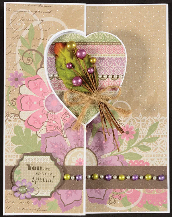 For the Front: Use the paper patterns from the package insert to cut the exact shapes to fit your card. To do this, cut out the patterns, trace them with pencil on your chosen paper, then cut out and glue to their corresponding blank panels. Place the die cut card flat with the heart near the top left. Fold the die cut card by making a mountain fold on the first score line and a valley fold on the second score line (without folding the heart). Place the floral corner paper with the flowers in the bottom left and cut out a Left Side, Spine, and Right Side from this corner. Glue to card.