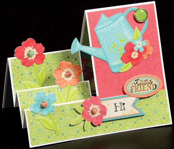 Glue the watering can to the right side as shown. Stamp "To My Favorite Friend" on an oval die-cut and "Hi" on the small banner. Glue the banner to the bottom of the red part as shown, and foam tape the oval above and to the right, overlapping a bit. Foam tape a red die-cut flower to the left side of the banner die-cut. Punch out red, orange, and blue flowers with stems. Glue the red to the back step on the left side. Glue the orange to the middle step on the right side, and the green to the front as shown. Take 3 pearl brads and bend each of the prongs back and forth until they break off. Place foam tape on the back of each and apply to the center of each flower. Break the prongs off of a medium green brad and foam tape to the watering can handle.