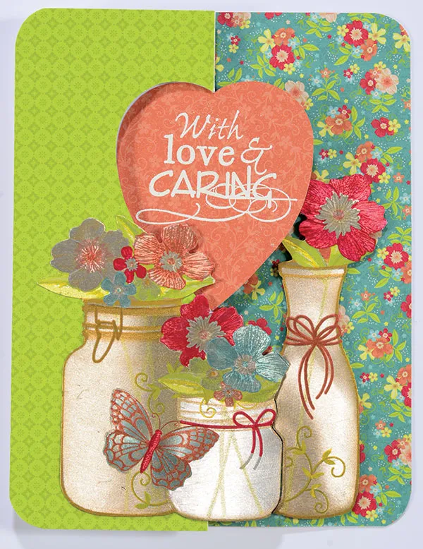 Punch out the first two layers of the bunch of jars image from the Papier Tole. On the first layer, carefully cut between the center and right jars. Foam tape the two left jars centered on the card front (with the short jar going over the center fold). Align the third jar with the rest and foam tape it to the inside. Take the second Papier Tole layer (short jar), align it under the front short jar and foam tape it to the inside. Trim the butterfly so it won't run into the fold. Test out the heart swing mechanism by opening and closing your card; trim anything that blocks the mechanism. Round all corners with the Corner Chomper (1/2").