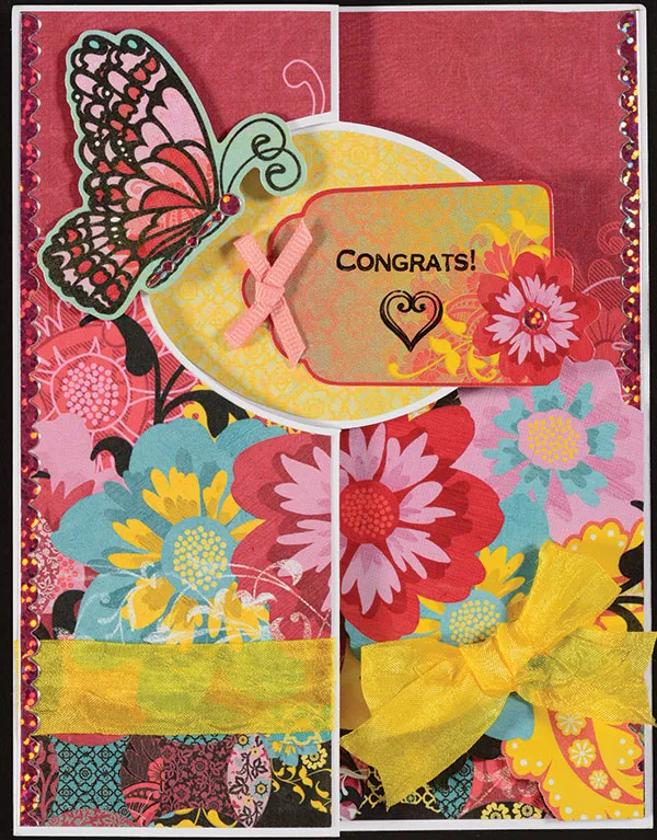 Glue yellow crepe ribbon across the front panel, 3/4" from the bottom. Trim to fit on the panel. Place a scallop Jewel Border Dazzles™ along the left edge. Foam tape a die-cut butterfly in the top left corner, overlapping the oval a bit (do not foam tape to the oval, or the mechanism won't work). Stamp "Congrats" and heart on a sideways tag from the die cuts and foam tape to the oval, going off the right side a little as shown. Glue a small pink grosgrain bow to the end of the tag. Trim off a round piece of one of the Dazzles™ borders and place in the center of the red flower.