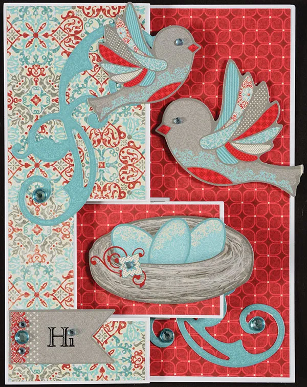 Glue the nest die-cut to the rectangle. Glue a large blue swirl die-cut to the upper left. Glue a small bird to the top, going off the front panel as shown. Stamp "Hi" on a gray flag and glue it to the lower left. Add blue bling to the bird's eye, flower on the nest, and greeting as shown.