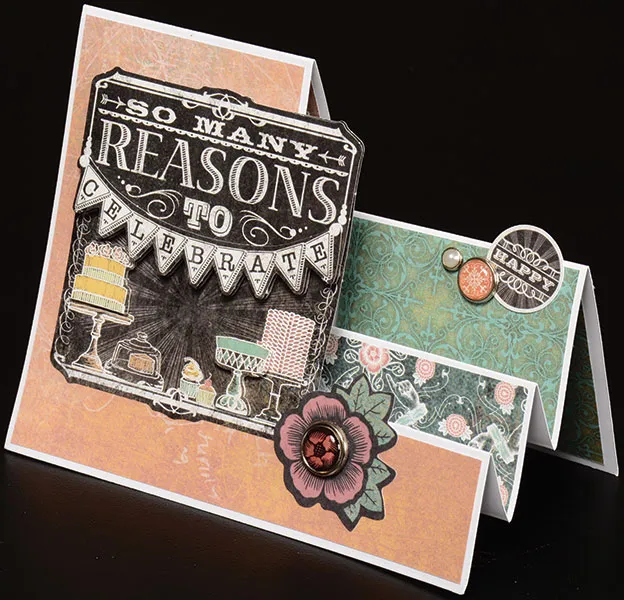 For the Front: Use the paper patterns from the package insert to cut the exact shapes to fit your card. To do this, cut out the patterns, trace them with pencil on your chosen paper, then cut out and glue to their corresponding blank panels. Place the flat die cut card vertically with the side step score lines on the right. Fold the die cut card by making a valley fold on the topmost score line and a mountain fold on the next score line; repeat all the way down. When gluing on your paper, use pink for the front, black pattern for the middle step, and green pattern for the back step.