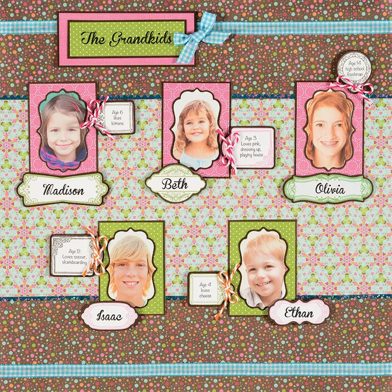 Embellishments: Glue a blue gingham bow to the right of "The Grandkids" title. Place pieces of Teal Jewel Border Dazzles along the top and bottom of the blue patterned piece as shown, trimming where necessary. Glue pink/white twine bows to all the pink photo caption tags, and glue orange/white twine bows to all the green photo caption tags, as shown.