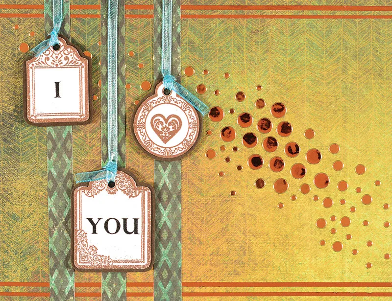 Glue 1/2" x 5" of green diamond paper 3/4" from the left. Glue two more identical strips, each spaced 1/2" from each other. Print "I" and "YOU" spaced out on white cardstock. Stamp and emboss the tags around the words using copper embossing powder. Emboss the circle tag on white cardstock and emboss the heart in the center. Cut out all tags using the matching cutting dies. I used small pieces of clear tape to hold the dies centered over the stamped images. Mat all the tags on brown cardstock with a 1/16" border. Re-punch the holes with a 1/8" hole punch. String narrow sheer blue ribbon through the "I" tag. Foam tape the tag to the card 1/4" from the left and 1/2" from the top. Glue the ribbon down with Zips ™. Tie ribbon through the "YOU" tag and foam tape to the card 1/2" from the bottom and 1 1/4" from the left. Glue down the length of ribbon going off the top of the card and trim excess. Do the same with the heart tag, foam taping it 2 1/4" from the left and 1 1/4" from the top.