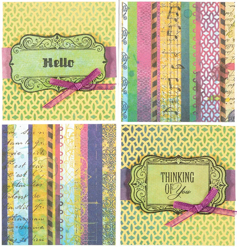 For the front: Assemble your pop-up box card according to the package instructions. Close the card flat so 4 panels are showing. Cover the top left and bottom right panels with yellow pattern paper. Glue a 3/4" strip of purple across the centers. Stamp 2 labels and greetings on green paper as shown and cut out using the matching die. Foam tape the labels to the panels as shown. Glue a small purple sheer bow to the bottom rigtht of each greeting as shown. Cover the top right and bottom left panels with striped paper. Flip the flat card over to the back. Cover the bottom left panel with stripe paper - the right side should be the tall, straight panel.