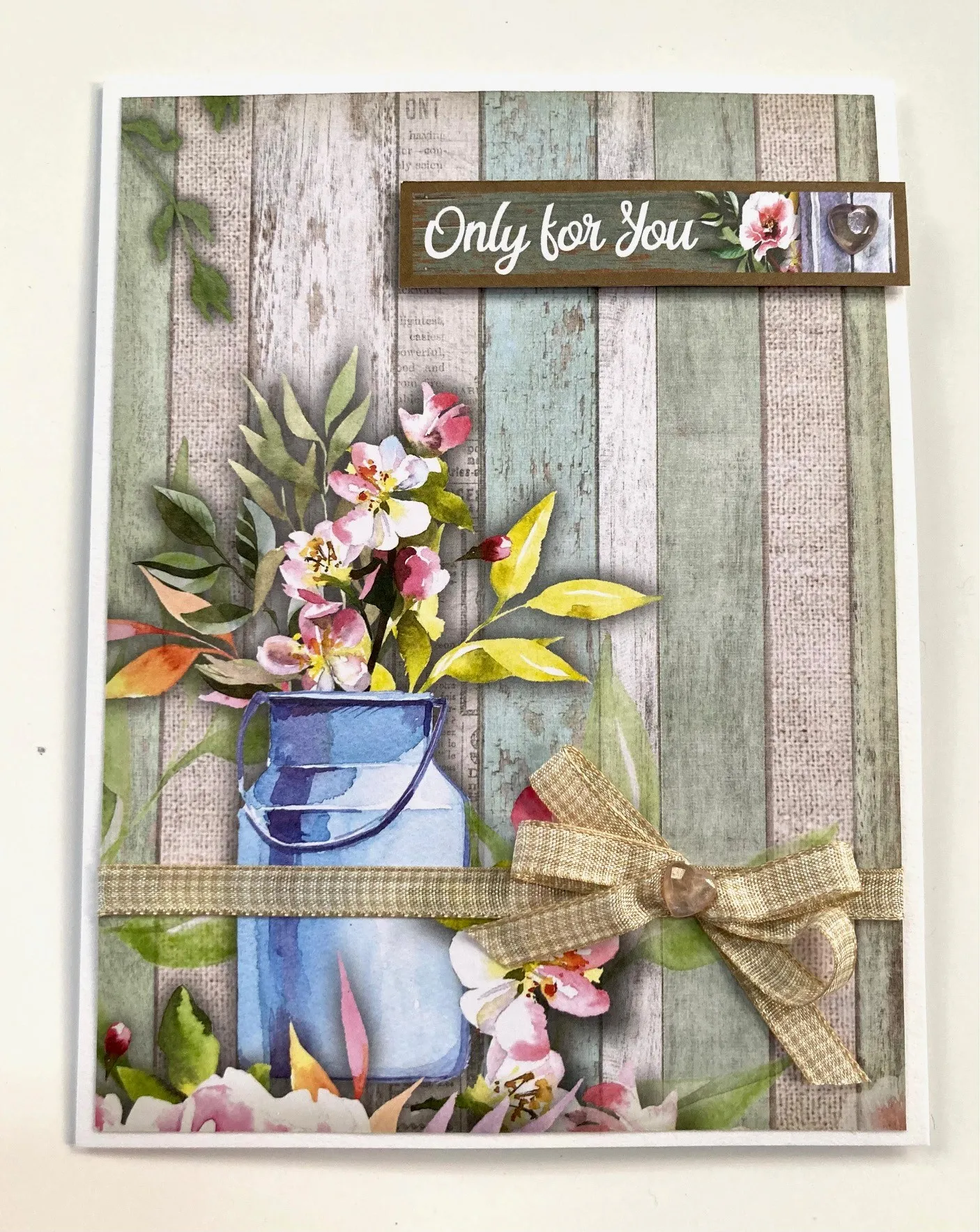 1. For the card front: Place the card with the fold on the left. Cut 4¾"x6¼" Window View pastel boards cardstock with the milk can in the lower left corner. Wrap tan gingham ribbon across it, 1¼" from the bottom, and glue the ends to the back. Glue the cardstock centered on the card front.