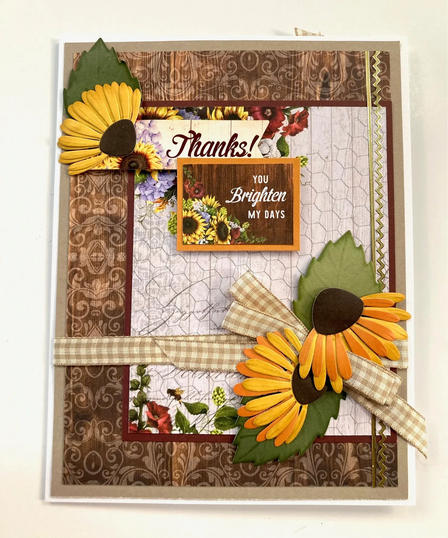 1. For the card front: Place the card with the fold on the left. Cut 4½"x6" Sunflowers brown swirly boards cardstock and mat it on tan cardstock with ⅛" borders. Cut 3½"x4½" Sunflowers corner design cardstock and mat it on brown cardstock with 1/16" borders. Glue it to the first cardstock along the right edge of the swirly boards cardstock.