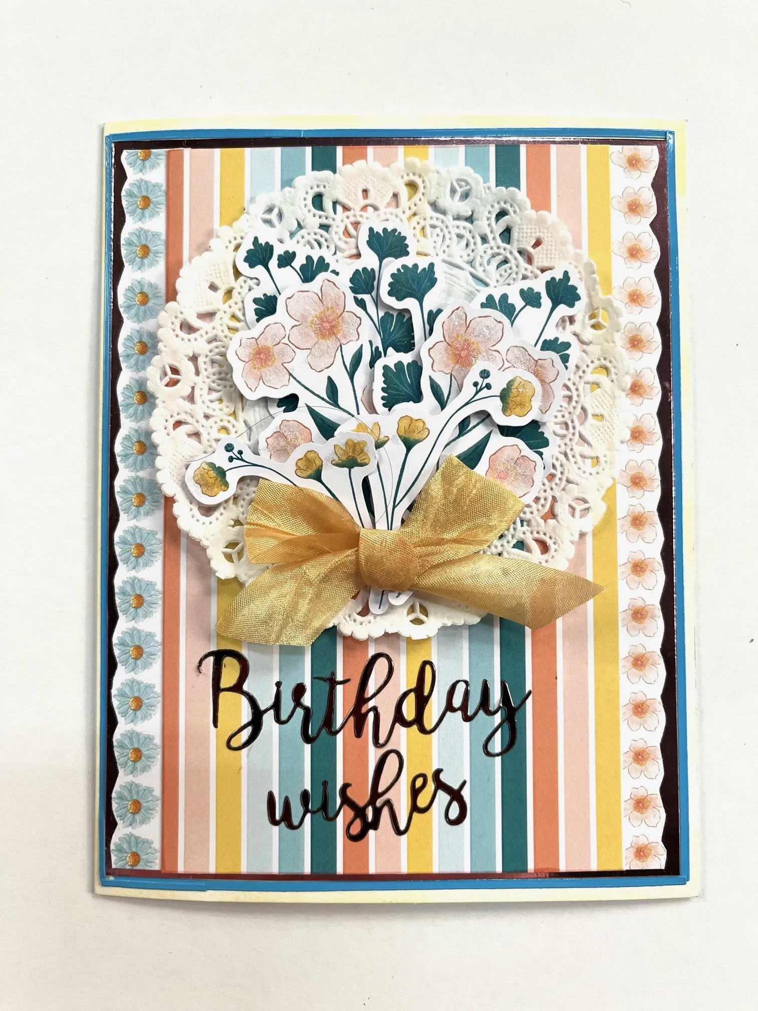 3. Glue just the center of a doily to the top of the card. Glue and foam tape the die-cut flowers as shown. Zot™ a 2” wide yellow crepe bow at the bottom of the flower stems. Place “Birthday wishes” Dazzles™ at the bottom.