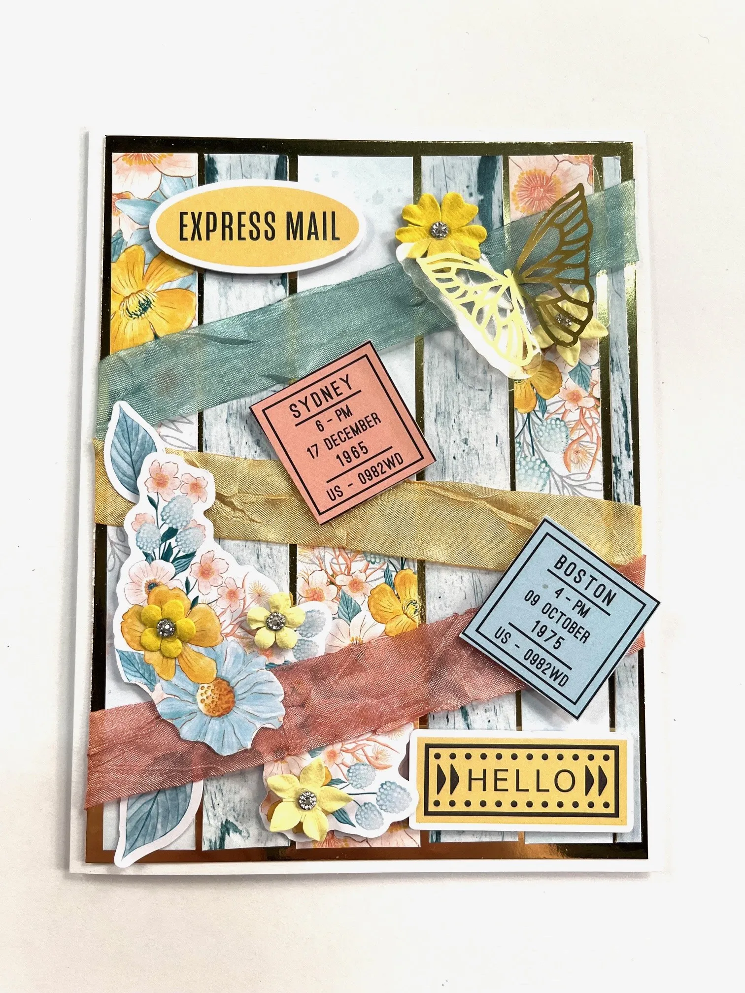 2. Foam tape cutouts from the paper pad as shown. Foam tape floral die-cuts on the bottom left. Remove a foiled acetate butterfly and fold on each side of the body. Place Extra Sticky Tape on the back of the body and apply to the card. Glue Sunshine flowers as shown.