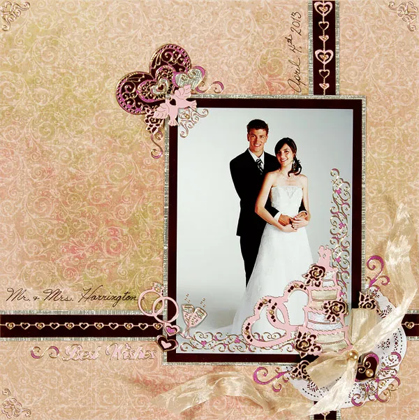 Mat a 5”x7” photo on suede with a 1/4” border, then on silver linen paper with a 1/8” border and glue 1 1/2” from the bottom right corner. Write the happy couple’s name and wedding date, as shown. Place “Best Wishes” Dazzles™ as shown, with a scroll. Place corner Dazzles™ and three page corners, as shown.