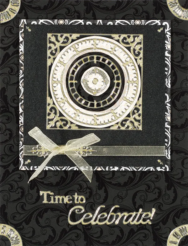 Card Front: Place your card with the fold on the left and cover with Black Lace Shine paper. Cut the 1 1/8” clock face Dazzles™ in quarters and place in the corners as shown.