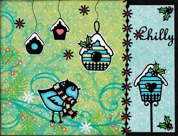 Place holly corner Dazzles™ on the top and bottom right corners on the blue dot paper. Color with CG4 and CR6. Place the “Chilly” greeting near the top of the blue dot paper. Back the birdhouse on the post with white cardstock. Color the house IB2, CR6 and CG4. Cut out around the house and glue to the bottom of the blue dot paper. Place dots of glitter glue on the snowflakes and border. Let dry.