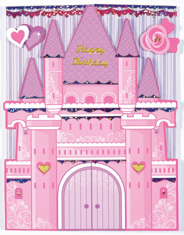 Glue the left side of the of the castle die-cut to the left side of the gate fold card. Embellish the castle with Purple Jewel Dazzles™ and Gold Heart Pearl Jewel Dazzles™. Place Gold Tiny Words & Phrases Dazzles™ “Happy Birthday” on the castle roof as shown. Glue and foam tape Die Cut hearts and flowers to the top corners as shown.