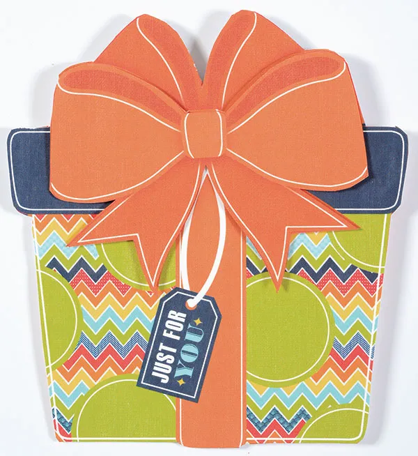 Card Front: Place the card fold on the side. Glue the left edge of the gift background even with the fold with a portion of the lid extending over the fold by 1/4”. Glue Happy Days orange circle paper to the inside of the card and cut around the present through both layers of the card.