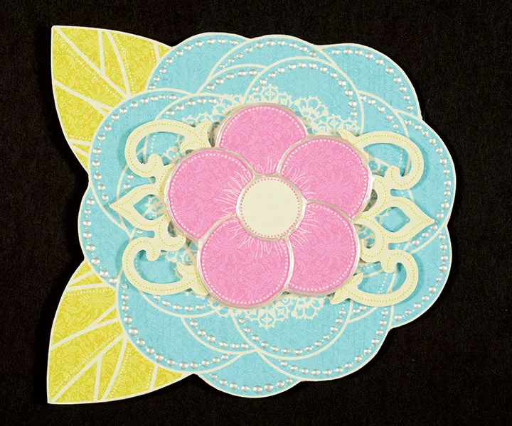 For the Front: Place the card with the fold on the left. Glue the large flower to the front of the card with the leaves on the left, so that the fold is hidden by the flower. Cut around the die-cut to create your shaped card. Foam tape the pink inner flower to the center. Foam tape the white flourishes tucked under each side of the pink flower. Use Liquid Pearls™ to line the petals of the inner flower and line the blue petals with rows of small dots. Let dry overnight.