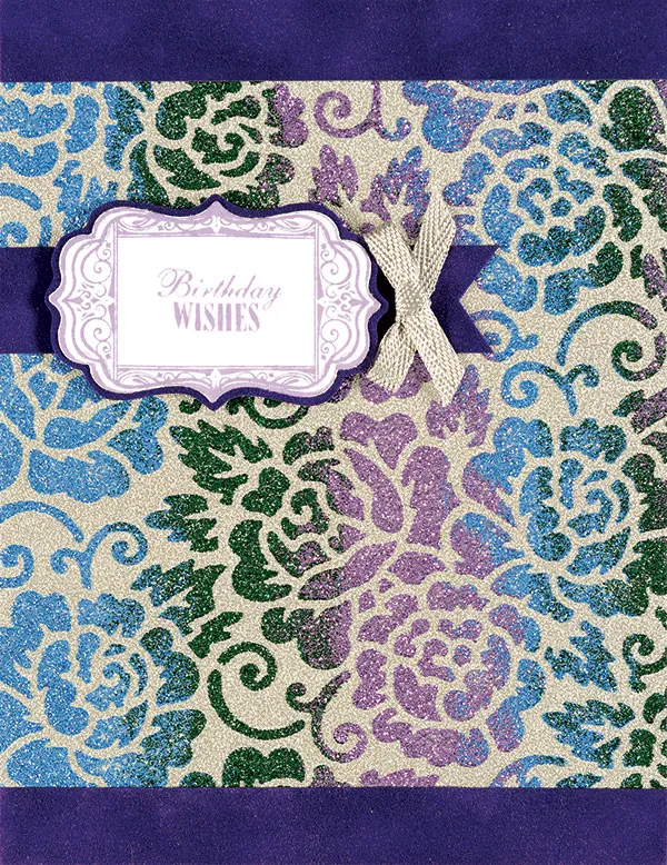 For the front: Place your card with the fold on the left. Take out a sheet of silver pearl material and tape the stencil to it, leaving 1" of space between the edge of the stencil and the edge of the sheet. Scoop out a small amount of Perrywinkle Sparkle Texture Paste with the mini squeegee and scrape it over the left side and middle of the stencil. Wipe off the squeegee. Apply Holly Green paste next to the Perrywinkle areas. Wipe of the squeegee. Apply Lavender Mist paste to the remaining empty areas. Clean squeegee. Give the stencil one last scrape down. Carefully remove the stencil tape and stencil from the sheet and set aside to dry for 2-3 hours, until it is completely clear. Once dry, cut the stenciled piece to 5"x6 1/2" and apply to the card front - there will be a silver border along the top and bottom. Save the stenciled strip that you cut off. Glue 5"x5/8" Violet suede paper across the top and bottom. Cut 4"x3/4" of suede and cut a V in the right side. Glue to the card on the left side, 1 3/4" from the top. Die-cut a label shape from white cardstock and stamp the frame and greeting on it as shown. Mat on suede paper with a 1/16" border and foam tape to card 1/4" from the left and 1 1/2" from the top. Glue a small silver twill bow to the right of the label as shown.